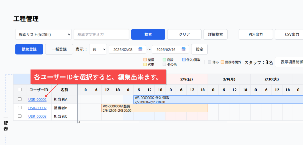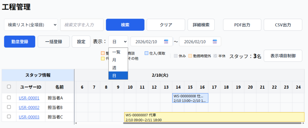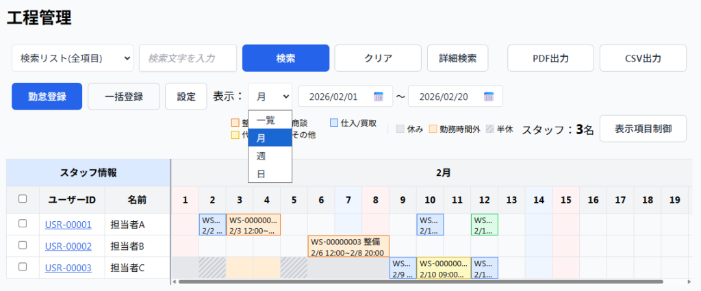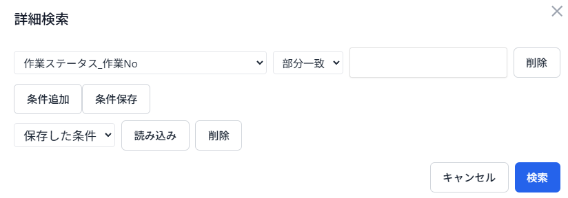1. 検索フォームに検索ワードを入力(例:作業ステータスやスタッフ情報、工程情報など)