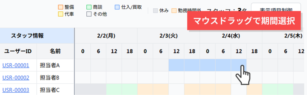 ※以下の図では、担当者Aの、2/3(火) 12:00 ~ 2/4(水)18:00 までの期間を選択。