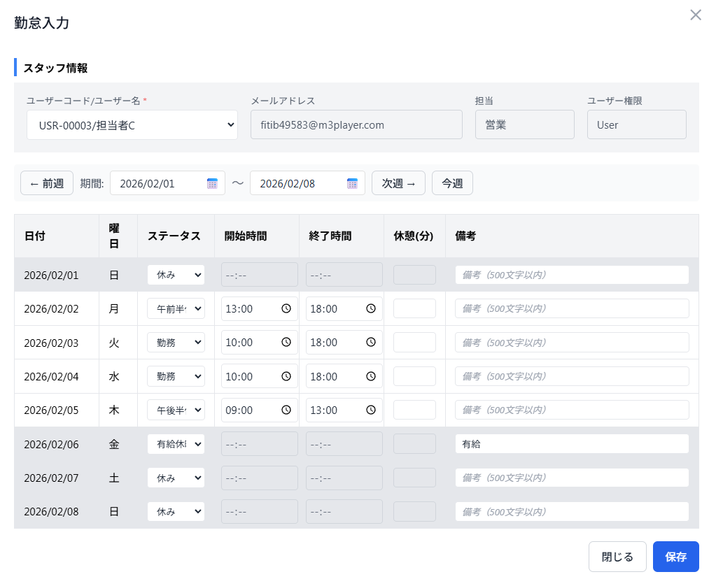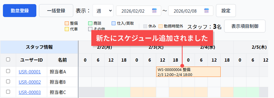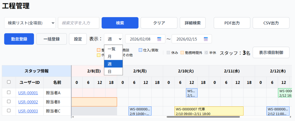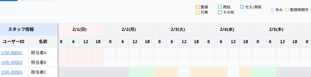 スタッフの勤怠スケジュールを管理する画面です。