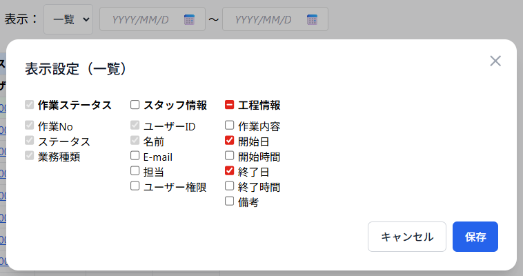 一覧表に表示する列を選択できます。必要な情報だけを表示したい場合に便利です。