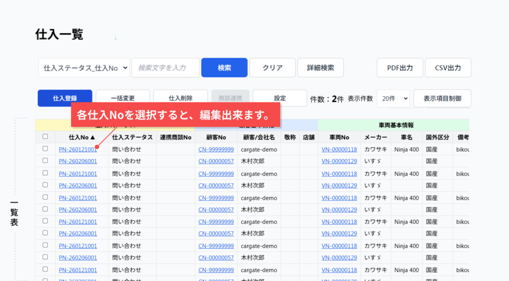- 表内の仕入No (青のテキスト)をクリック。