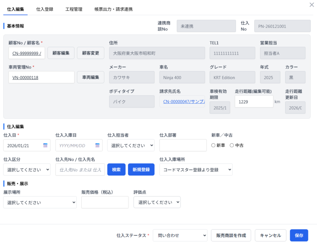 - 顧客・車両を選択。(もしくは、顧客・車両を新規登録)