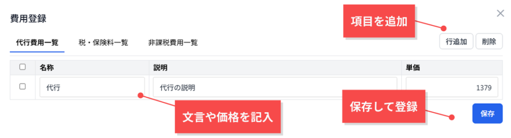 (代行費用一覧 / 税・保険料一覧 / 非課税費用一覧 各項目設定できます。)