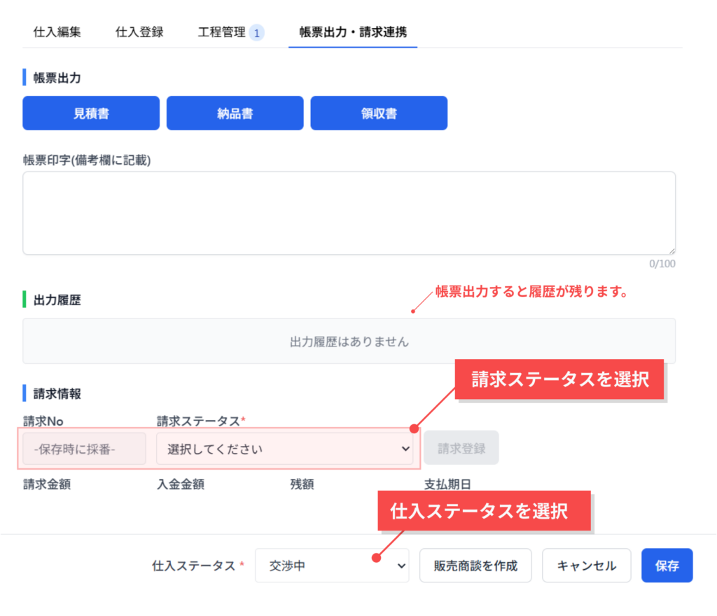 ※納品書、領収書を出力するには、「請求ステータス」「仕入ステータス」の設定が必要です。