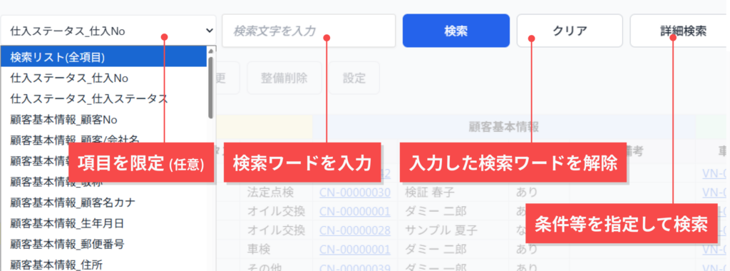 - 検索フォームに検索ワードを入力(例:顧客名、電話番号、車両番号)