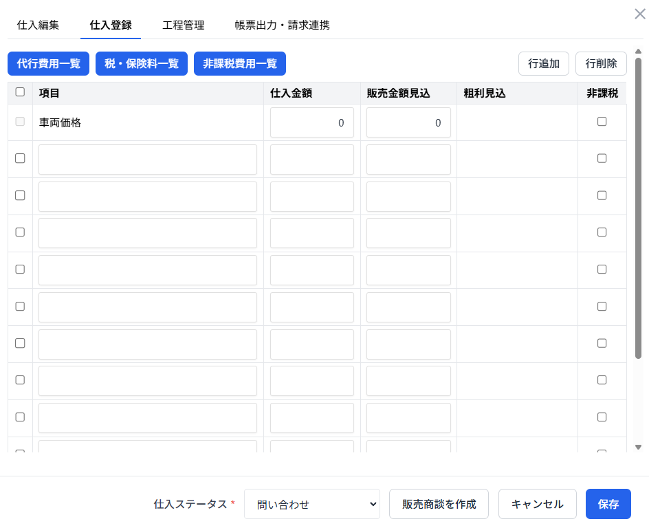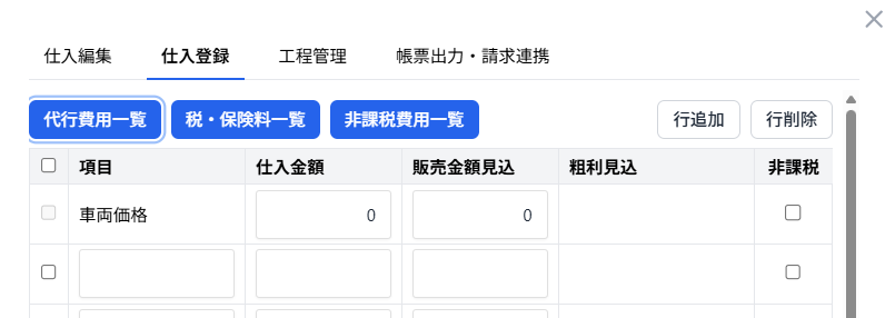 ※「設定」より、項目を設定済であれば「代行費用一覧 / 税・保険料一覧 / 非課税費用一覧 」からも、登録できます。