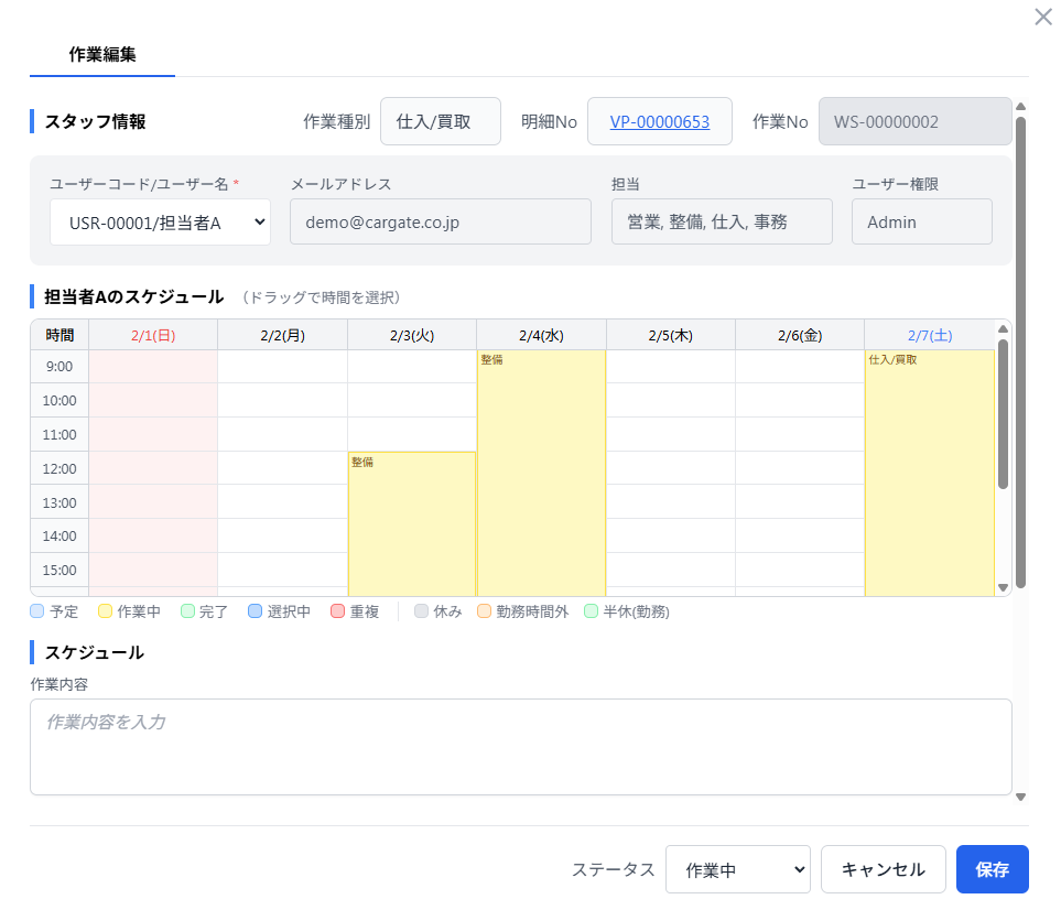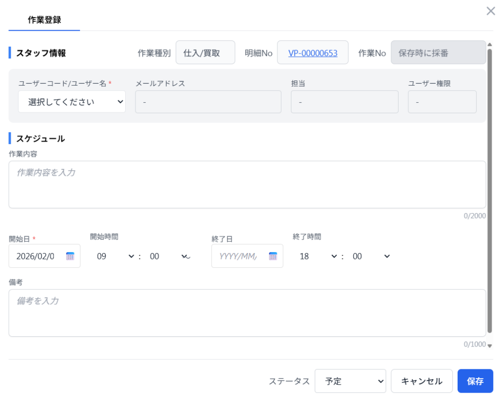 スケジュール項目内の 作業内容や、開始日・終了日、備考と下部ステータスを入力。*マークは必須