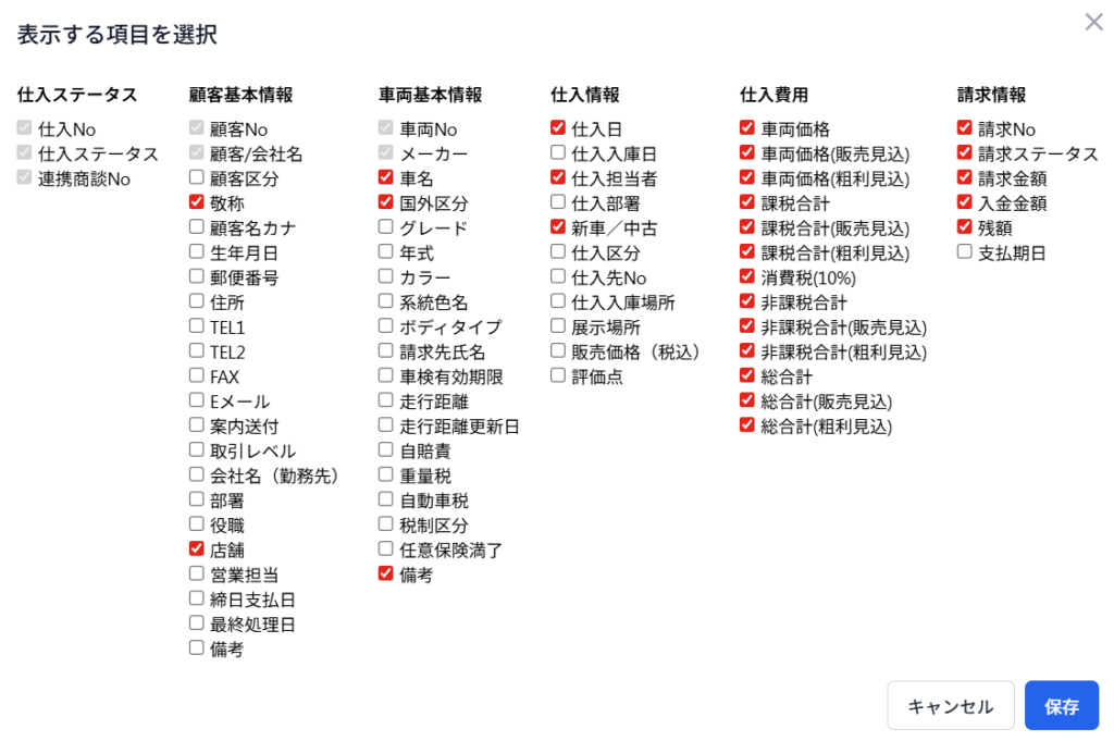 一覧表に表示する列を選択できます。必要な情報だけを表示したい場合に便利です。