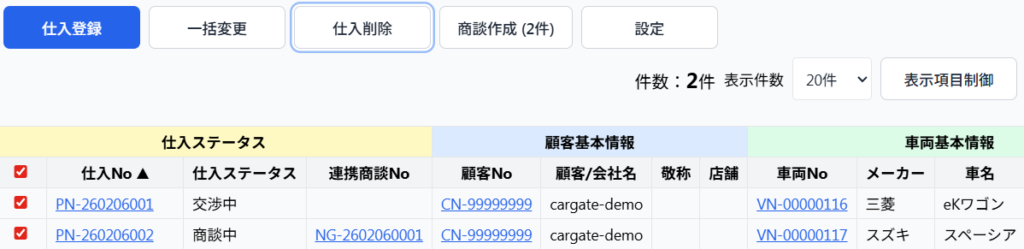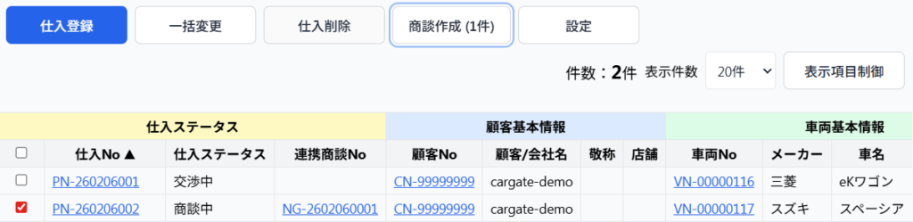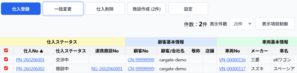 「商談中」「発注済み」「輸送中」「入庫済み」「検査済み」「キャンセル」のステータスも一括変更出来ます。
